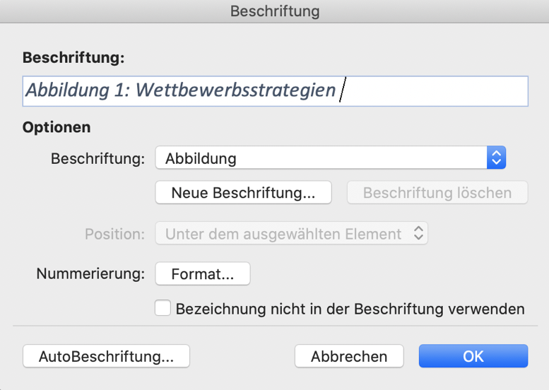 - Als nächstes gibst du die korrekte Beschriftung in dem neuen Dialogfenster ein. Word versieht die Abbildungen dabei automatisch mit Nummerierungen (Abbildung 1 etc.). Solltest du die Vorgabe haben, Quellen mit anzugeben, musst du diese direkt hinter der Bezeichnung anführen.