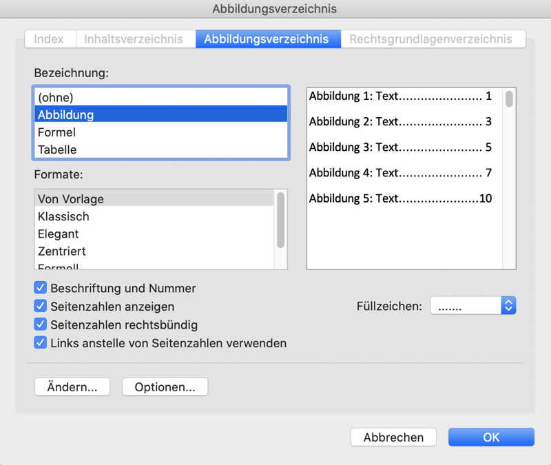 - Unter Abbildungsverzeichnis einfügen kannst du deine Auflistung vor der Bestätigung personalisieren: Wähle zwischen verschiedenen Füllzeichen und gib an, ob die Seitenzahlen dargestellt werden sollen oder nicht.