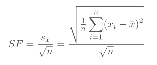 Der Standardfehler, hier als SF abgekürzt, ist der Quotient, der aus der Standardabweichung der von dir herangezogenen Stichprobe sx und der Wurzel aus dem Umfang der Stichprobe (n) gebildet wird.